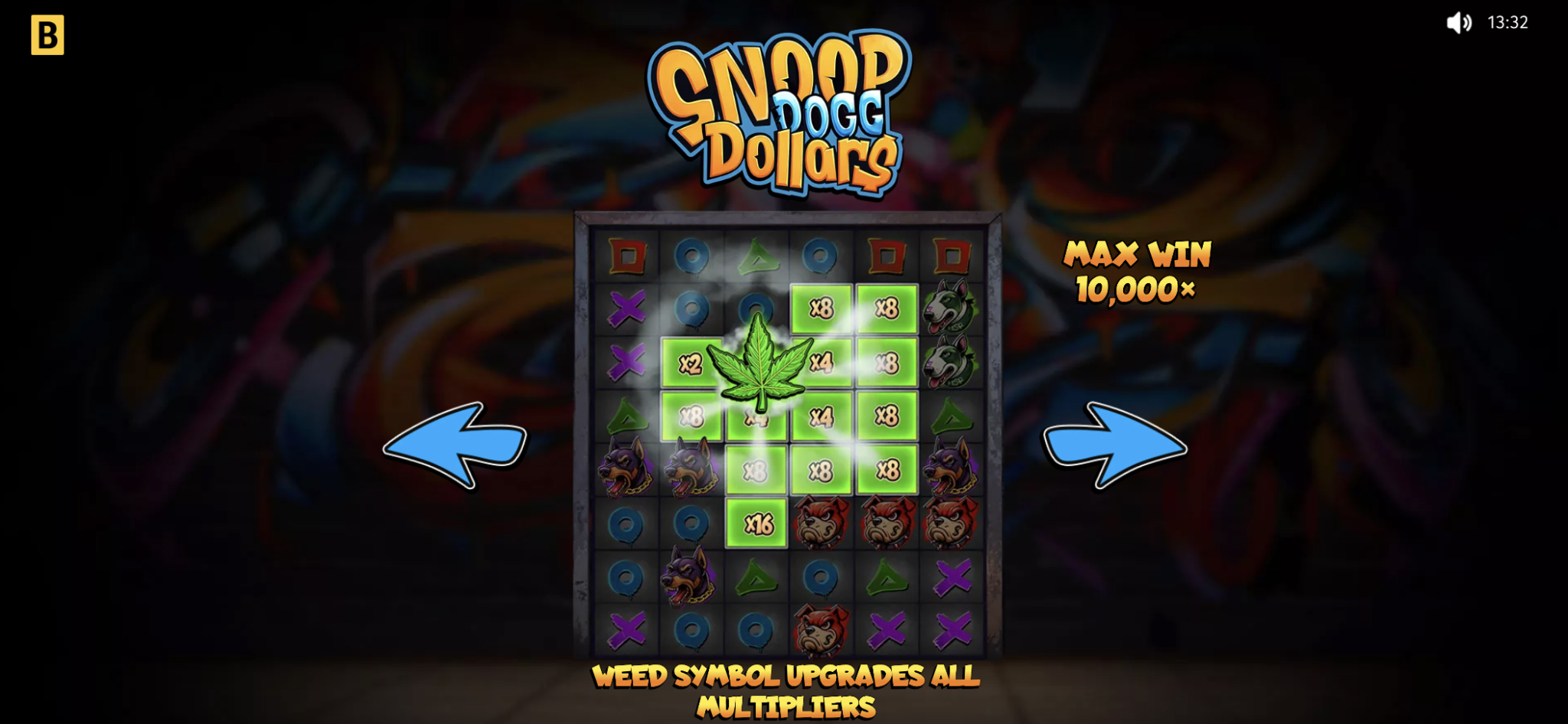 El máximo potencial de ganancias en Snoop Dogg Dollars es de 10.000x tu apuesta, que se puede conseguir mediante la combinación de comodines pegajosos y multiplicadores durante la función de tiradas gratuitas.