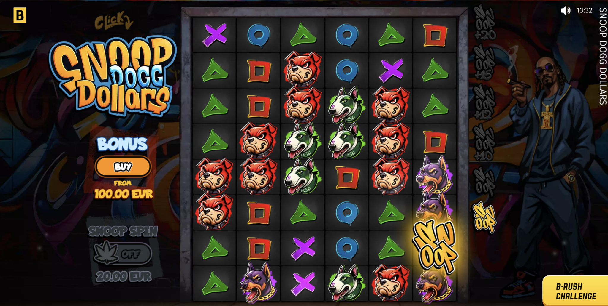 - Función Snoop Spin: Se activa aleatoriamente durante el juego base y añade entre 5 y 10 comodines.
