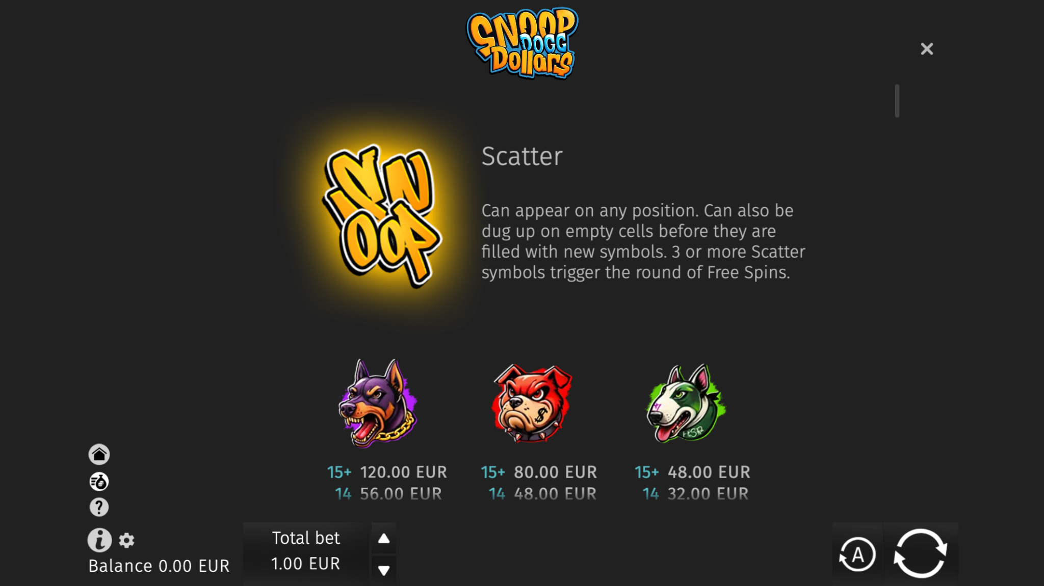 Las tiradas gratuitas de Snoop Dogg Dollars se activan al conseguir 3 o más símbolos scatter (representados por el símbolo del dólar) en cualquier lugar de los rodillos.