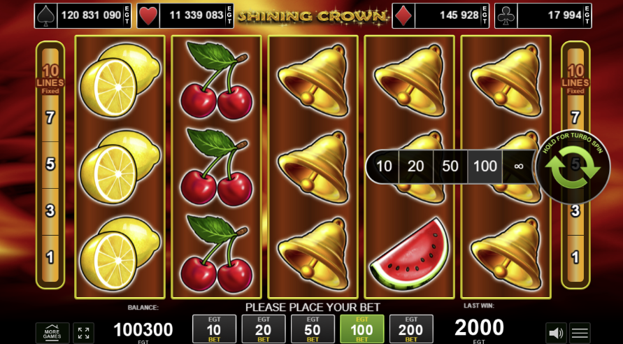 La slot Shining Crown trasporta i giocatori nel periodo di massimo splendore delle slot tradizionali, con un vivace assortimento di simboli di frutta brillanti insieme ai tradizionali lucky-7 e campane. Il simbolo della corona regale esalta questo tema nostalgico portando un elemento di regalità alla vostra esperienza di gioco.