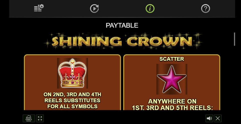 - Shining Crown offre un'esperienza di gioco semplice e nostalgica, con una classica griglia di 5×3 rulli e 10 linee di pagamento fisse, che la rendono facile sia per i principianti che per i giocatori esperti.